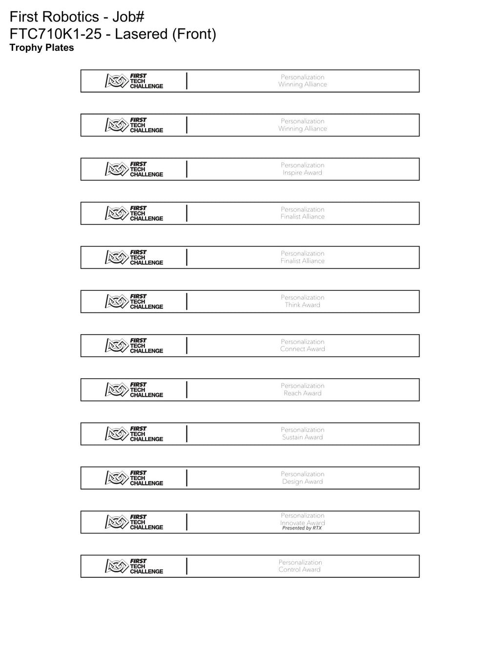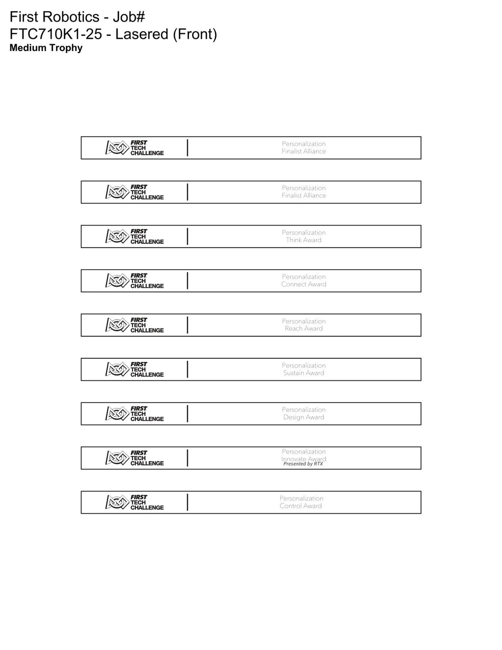 This Kit provides the essential awards needed to recognize outstanding achievements in FIRST Tech Challenge competitions. Featuring large and medium acrylic trophies, engraved plates, and medals, it ensures every team is celebrated for their innovation, teamwork, and performance.